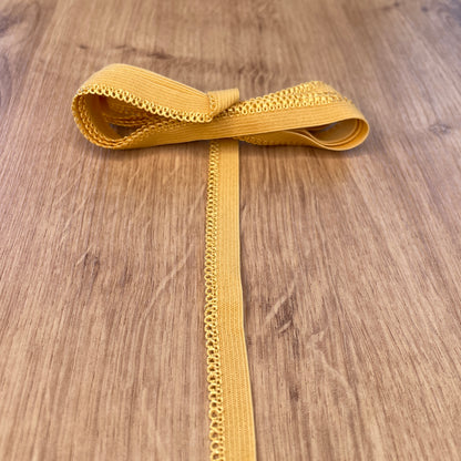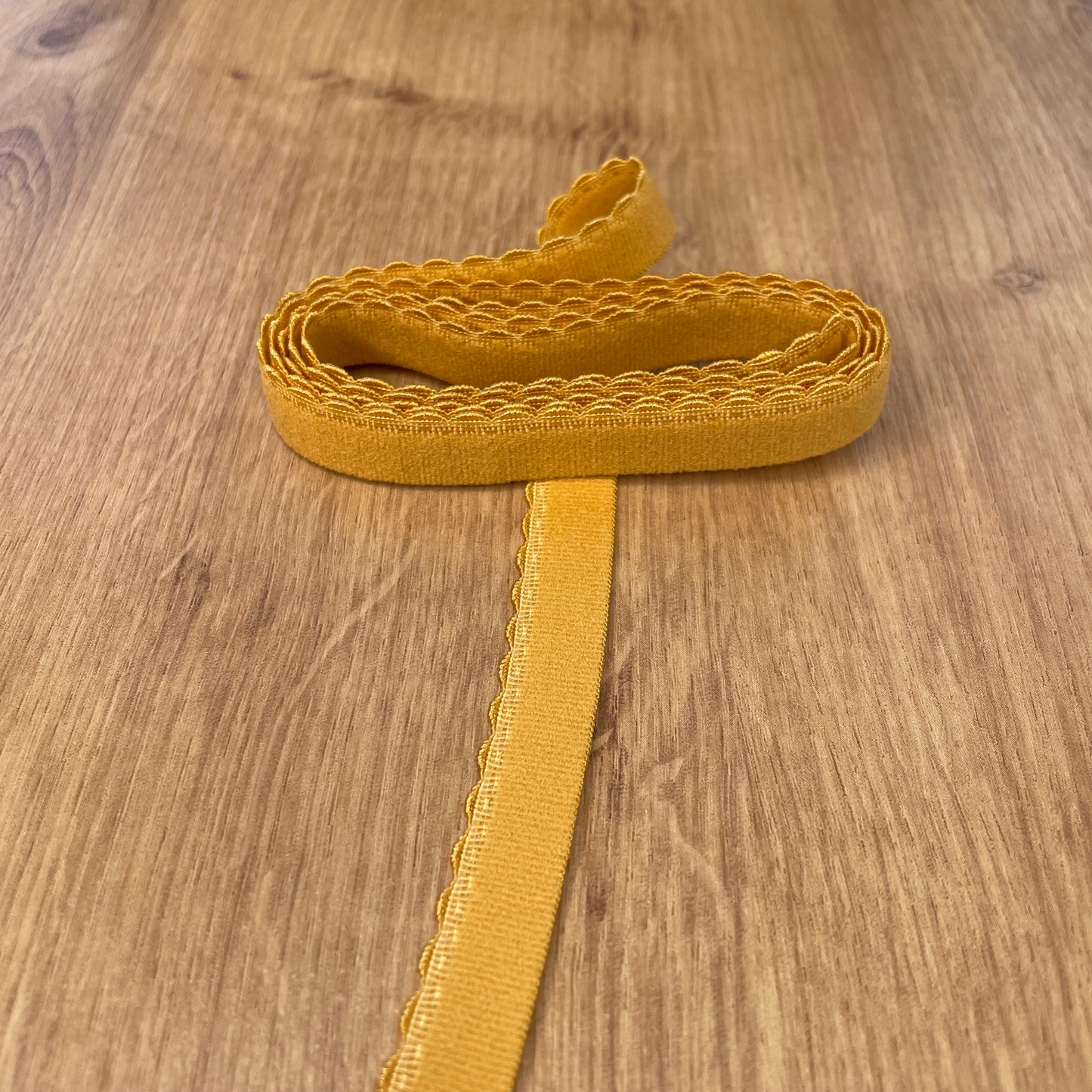 A decorative elastic with scallops along one edge - it has multi uses including around the neckline and armhole curves on bras or leg openings on underwear.