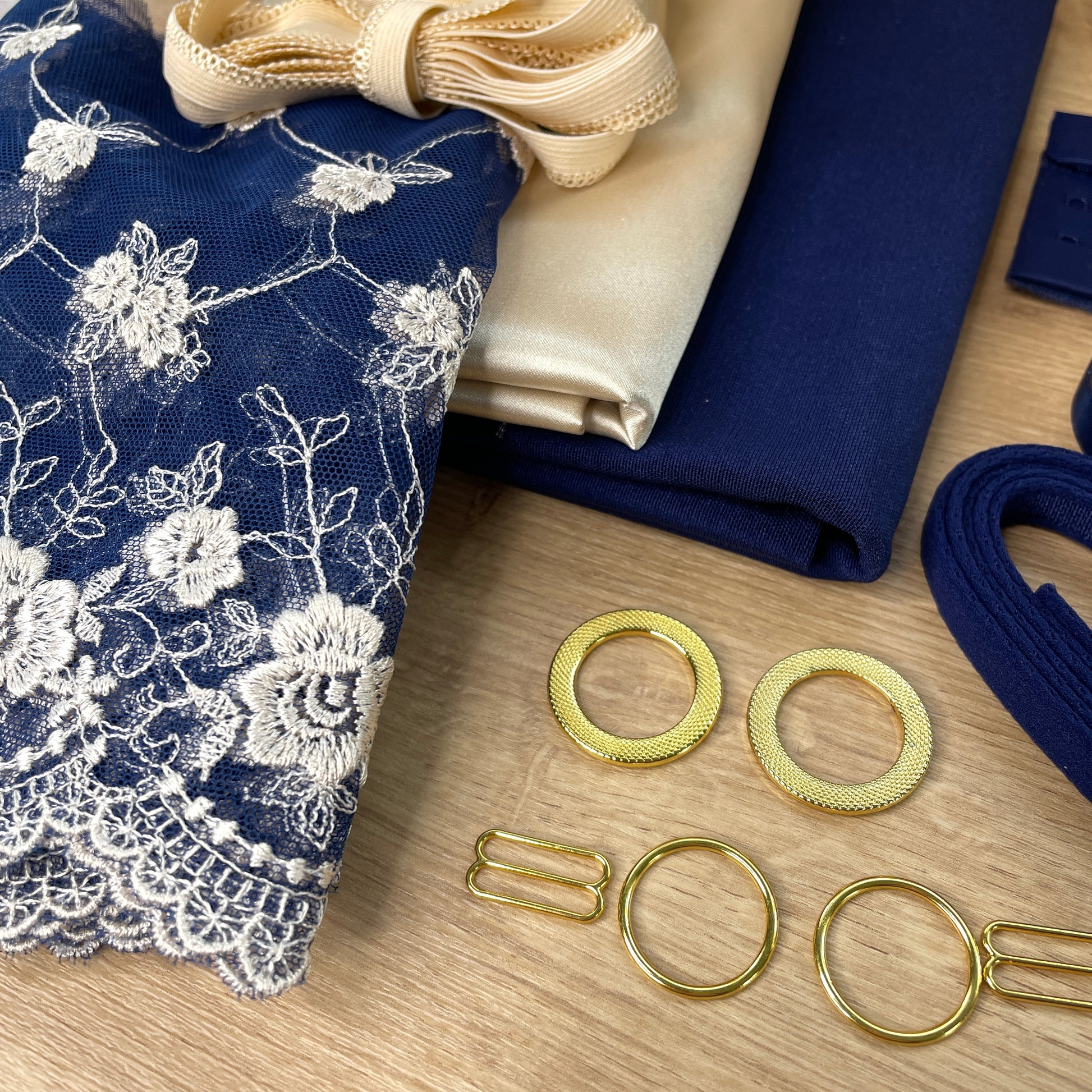 This kit has a combination of an elegant navy and golden-ivory embroidered tulle with a champagne satin - I love the look of sheer navy over champagne! A generous amount of powernet means you can not only use it for the bra but also the back panel of briefs. Simple golden beige elastics and gold findings complete the scene. The supporting star of this kit is a pair of delicate gold feature rings. See the inspiration sketches for an idea on their use.