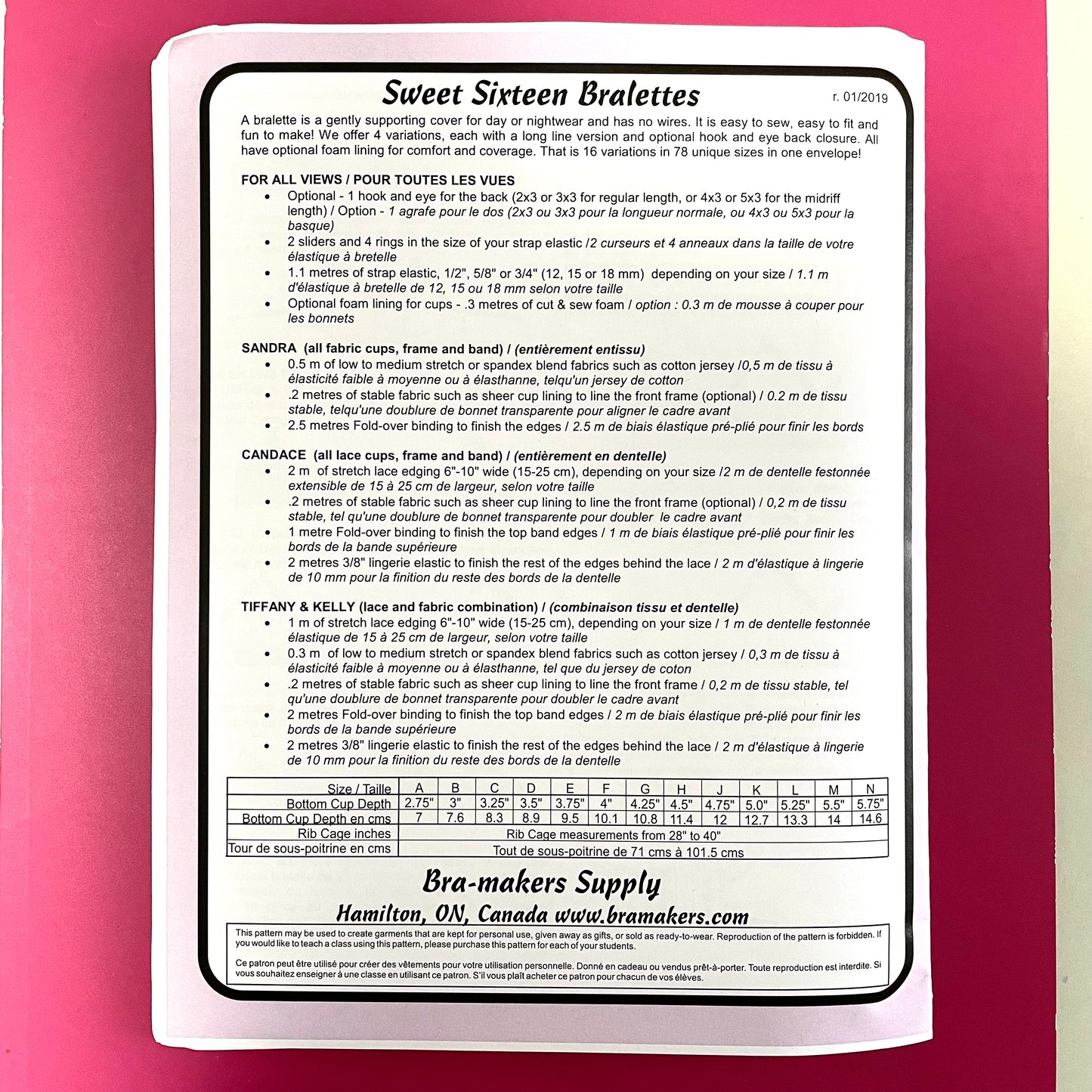 Sweet Sixteen has 16 views to make all, in one pattern envelope! Make this from stretch lace, fabric, or a combination of lace and fabric. You can line each variation with foam as well for a super comfy fit. Wait, there’s more! You have the option to make each one into a longline (midriff) version or the regular length. All sizes and variations are included in the envelope.